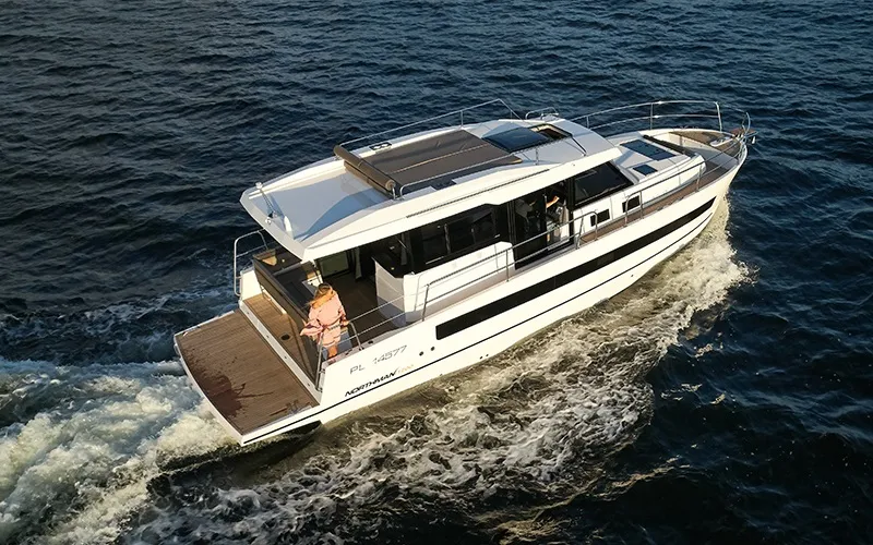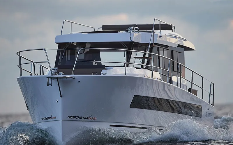 Die Northman 1200 ist zo konzipiert, dass die Schlafzimmer und Badezimmer zich unten befinden und der Wohnbereich und die Küche oben sind. Die Motoryacht hat 3 Schlafzimmer mit je einem Doppelbett und 2 Badezimmer mit Dusche, WC und Waschbecken. Am Tag genießen Sie einen 360-Grad-Blick und der Innenraum wird mit natürlichem Licht gefüllt. Die Northman 1200 hat ein stilvolles und helles Interieur. Die Yacht hat auch eine ideale Schiebetür am Steuerstand, die vorm Kapitänsstuhl aus direkt schnellem Zugang auf das breite Gangbord schafft. Die Yacht bietet eine moderne Küche mit einem elektrischen Kühlschrank, einem Induktionherd und einem Backofen. An der Backbordseite befindet sich ein schönes L-Sofa und ein Esstisch. Durch die Falttüren kann der Wohnbereich nach außen erweitert werden.